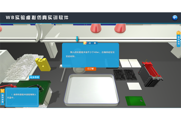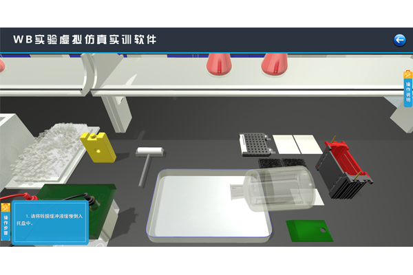 本软件主要为WB蛋白免疫印迹实验操作仿真模拟训练,该软件主要包含样品制备,SDS-PAGE电泳,蛋白转膜,一抗孵育,二抗孵育等步骤。运用虚拟仿真技术帮助老师及学生完成学习任务,且侧重知识点与技能点的学习,有着导训的作用。其中,仿真操作属于实操实训,重点在使用设备训练,完成实验教学的全部内容。同时锻炼学生自练自查,具有很强的情境性,操作性,交互性。